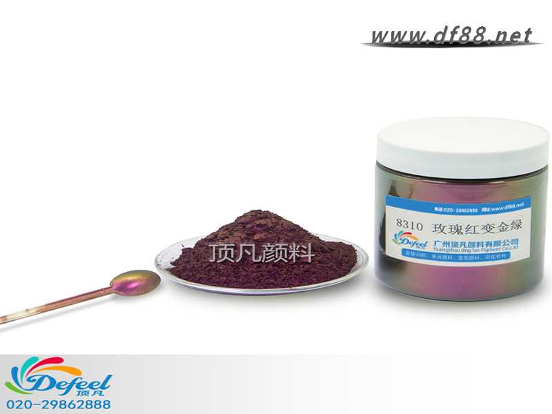 8310 玫瑰紅變金綠變色龍粉可應用于涂料、油墨、塑料各產業,產品之設計大多以室內(無紫外光之環境)與室外(有紫外光之環境)有顏色變化為訴求。